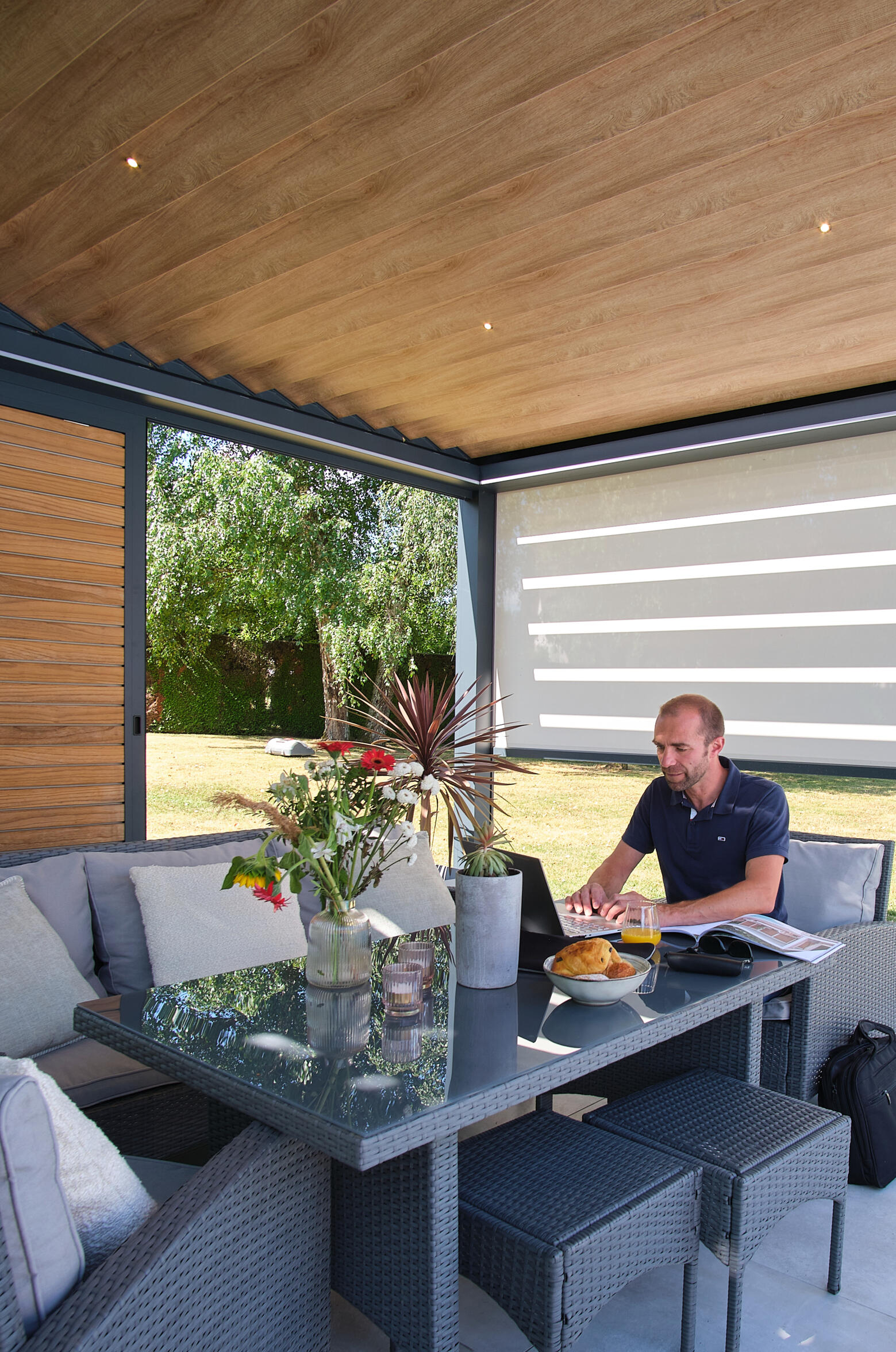 Le toit fixe vous protège des intempéries et laisse entrer la lumière naturelle, pour profiter pleinement des journées ensoleillées comme des soirées étoilées, à l'abri du soleil, de la pluie et du vent.